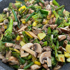 Start adding vegetables in order of longest to shortest cooking time. (In my case, it was Broccoli, Green Beans, and asparagus, then Zucchini and Squash, then Mushrooms).